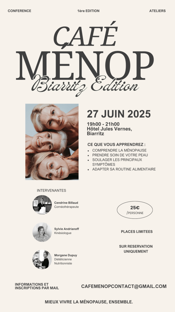 J’y animerai un atelier de diététique pour vous aider à adapter votre alimentation et soutenir votre équilibre hormonal à cette étape de vie souvent méconnue.